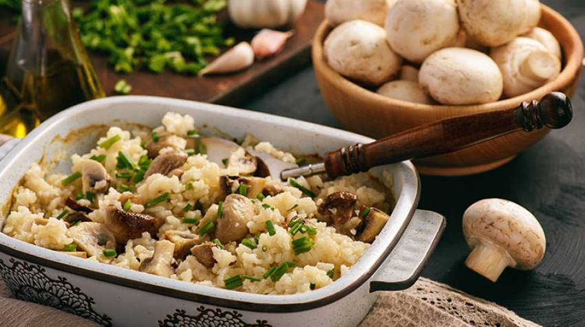 Acto seguido, añadiremos los champiñones y el arroz. Sazonar con sal y cubrir con el caldo previamente caliente. Cuando rompa a hervir, se meterá en el horno durante 15 minutos a 180ºC, hasta resultar tierno el arroz.