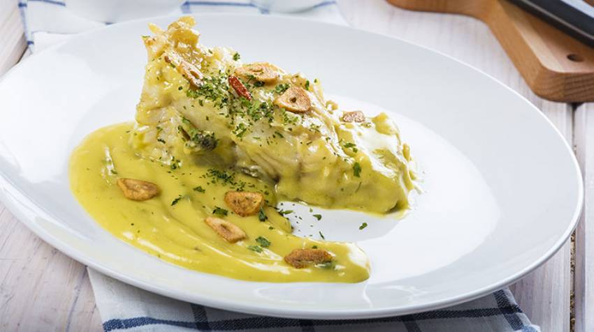 Una vez espesa, se salseará el bacalao y se decorará con el ajo y la guindilla. Servir caliente.